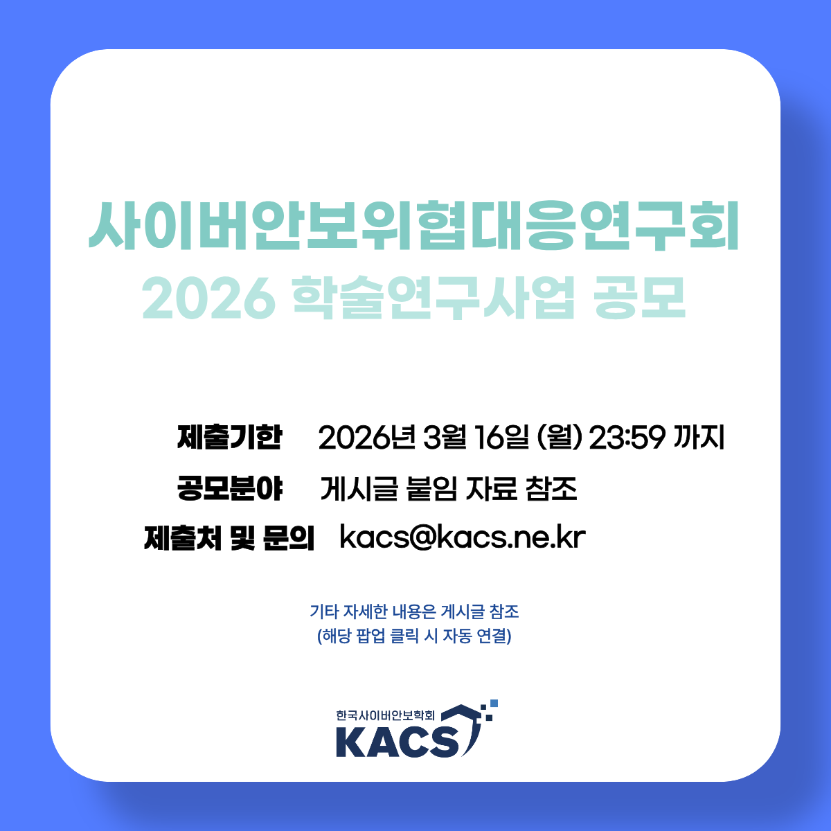 한국사이버안보학회 사이버안보위협대응연구회 2026 학술연구사업 공모(제출처 및 문의: kacs@kacs.ne.kr)