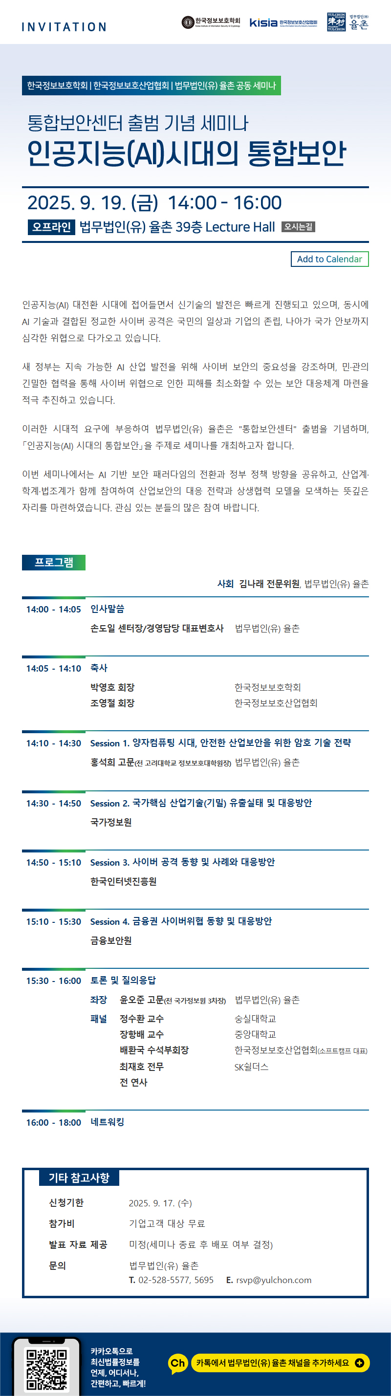 한국사이버안보학회 회원 및 관계자 여러분께 본 학회 윤오준 고문님의 세미나 소식을 전해드립니다.