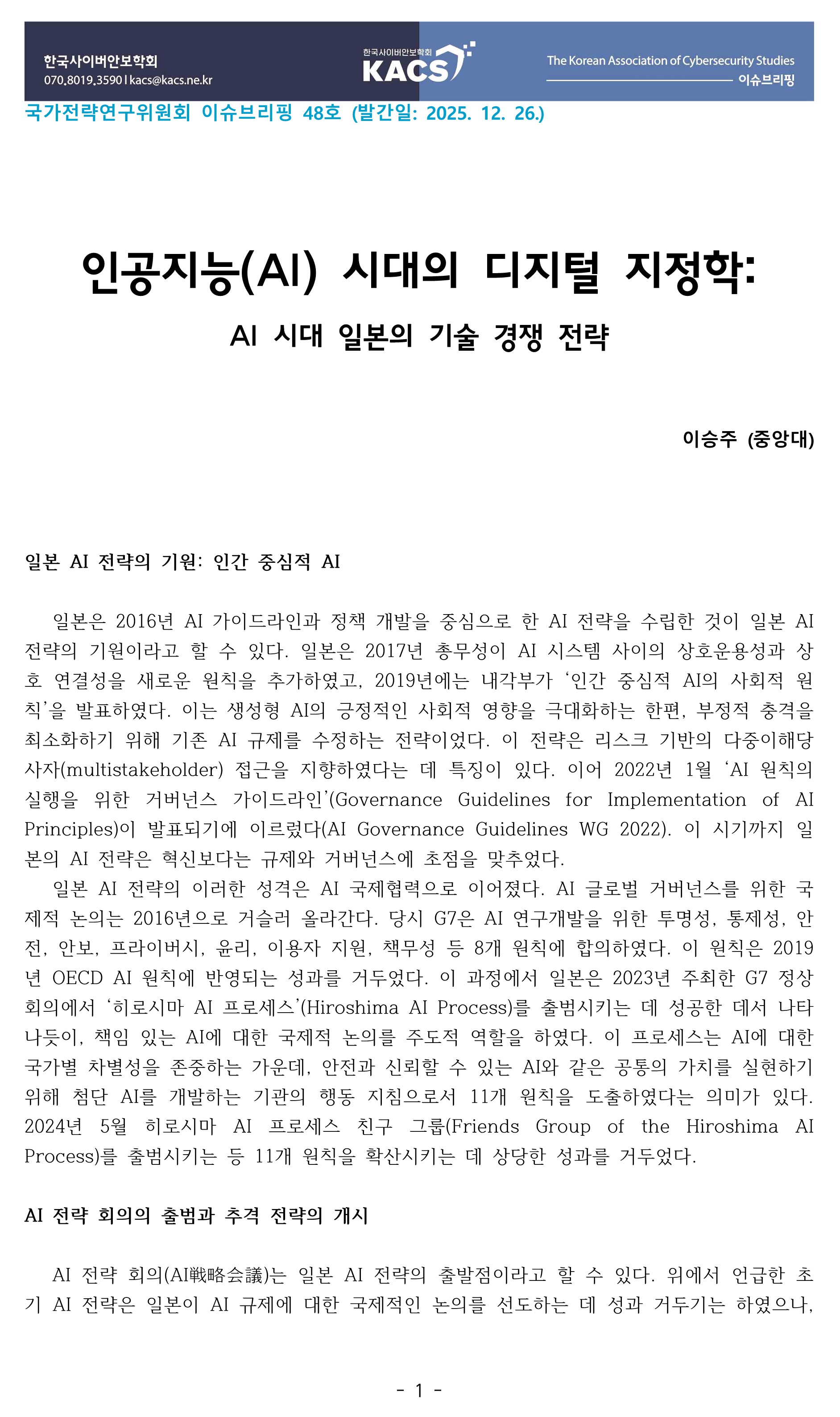 [이슈브리핑 48호](일본)이승주-인공지능(AI) 시대의 디지털 지정학: AI 시대 일본의 기술 경쟁 전략