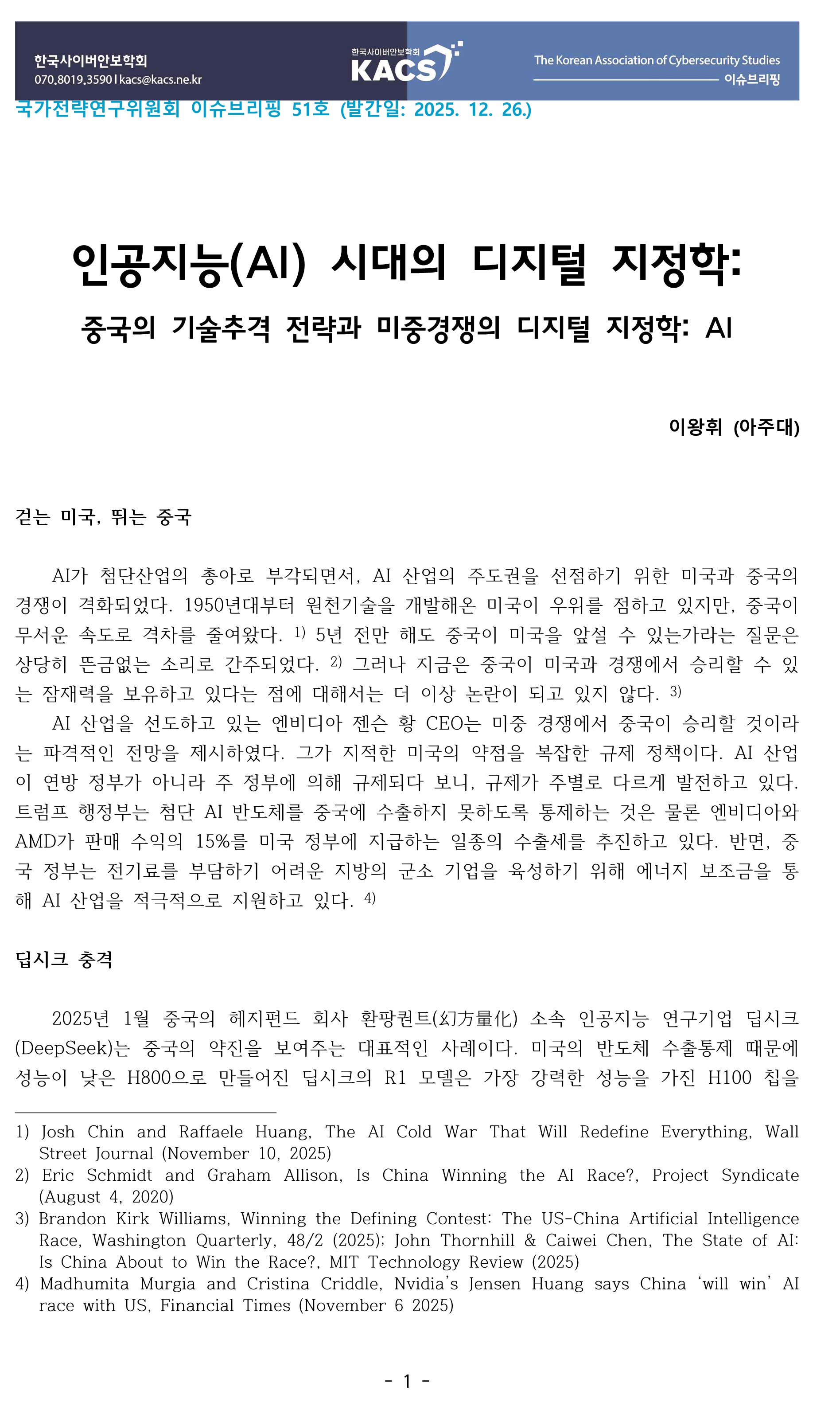 [이슈브리핑 51호](중국)이왕휘-인공지능(AI) 시대의 디지털 지정학: 중국의 기술추격 전략과 미중경쟁의 디지털 지정학: AI