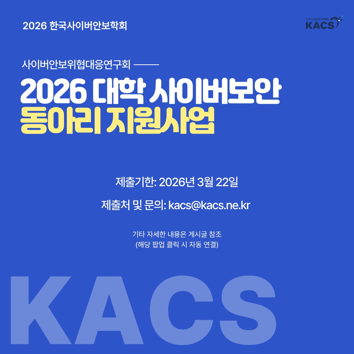 [연장공고]한국사이버안보학회 사이버안보위협대응연구회 2026 학술연구사업 공모(제출처 및 문의: kacs@kacs.ne.kr)