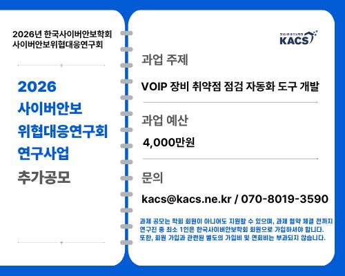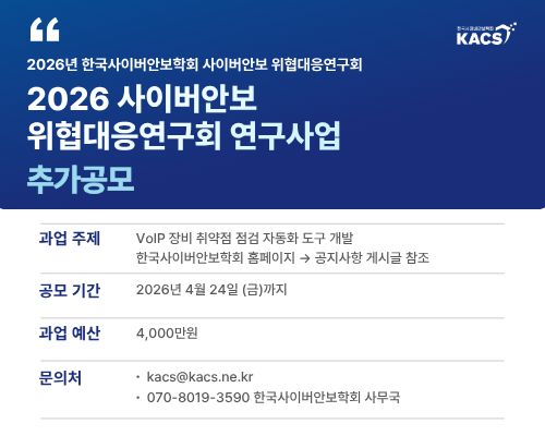 한국사이버안보학회 사이버안보위협대응연구회 2026 학술연구사업 공모(제출처 및 문의: kacs@kacs.ne.kr)